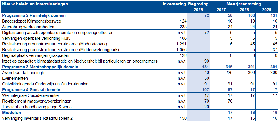 Terug naar navigatie - Bestuurlijke inleiding - Nieuw beleid en intensiveringenIn de kadernota is een beperkte lijst met nieuw beleid en intensiveringen opgenomen. In deze begroting voegen wij daar nog een onderwerp aan toe: Klimaatadaptie en biodiversiteit bij particulieren en ondernemers. Hiervoor is ruimte ontstaan doordat de CDOKE middelen die in 2026 via het gemeentefonds beschikbaar komen hoger zijn dan eerder bekend was.