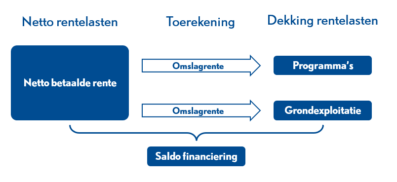 Om tot een verdeling van de (resterende) rente over de programma’s te komen, wordt het zogenaamde rente-omslagpercentage gebruikt. Het saldo van rentelasten en –baten wordt daarvoor gedeeld op het totaal van de vaste activa. De uitkomst mag binnen een bandbreedte van 0,5% worden afgerond, waarmee een jaarlijkse wijziging van het percentage wordt voorkomen. Voor 2026 is het berekende percentage 0,76%. Het omslagpercentage blijft gehandhaafd op 1%. Met dit percentage worden de programma’s belast waar de activa met boekwaarden onderdeel van uitmaken.
