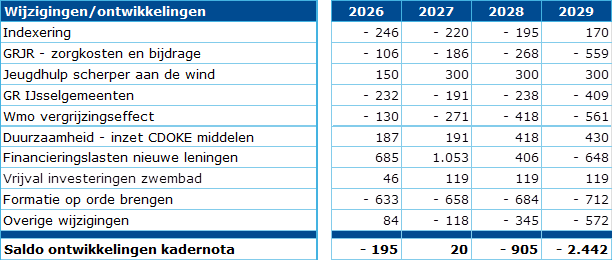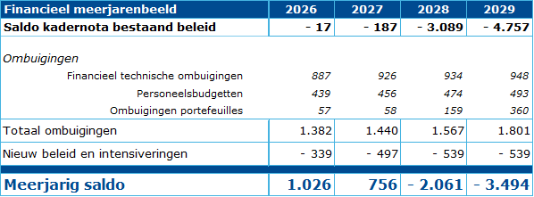 Terug naar navigatie - Financiën - Financieel meerjarenbeeld 2026-2029Na actualisatie van de ramingen, verwerking van de meicirculaire en ombuigingen en het opnemen van de effecten van nieuw beleid en intensiveringen is het eindbeeld van deze kadernota als volgt:
