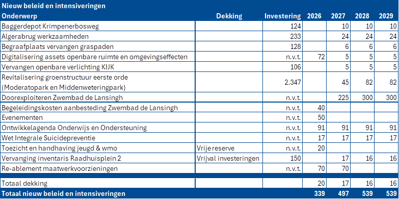 De extra middelen die we, in ieder geval de komende jaren, vanuit het gemeentefonds tegemoet mogen zien, geven ons de mogelijkheid om toch voorstellen voor nieuw beleid en intensiveringen te doen. Dat leidt deels tot structurele lasten waarmee de opgave in de toekomst weer groeit. Vanwege de onzekerheden en het beperkt inboeken van ombuigingen in deze kadernota, hebben we daar op dit moment nog geen aanvullende dekking voor gezocht.