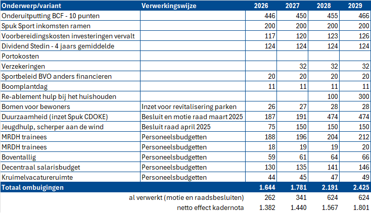 Over een aantal (inhoudelijke) ombuigingen heeft uw raad al een besluit genomen. De ombuigingen die betrekking hebben op personeelsbudgetten worden ingezet om een groot deel te dekken van de oplopende kosten als gevolg van het toekomstbestendig maken van onze ambtelijke organisatie.
