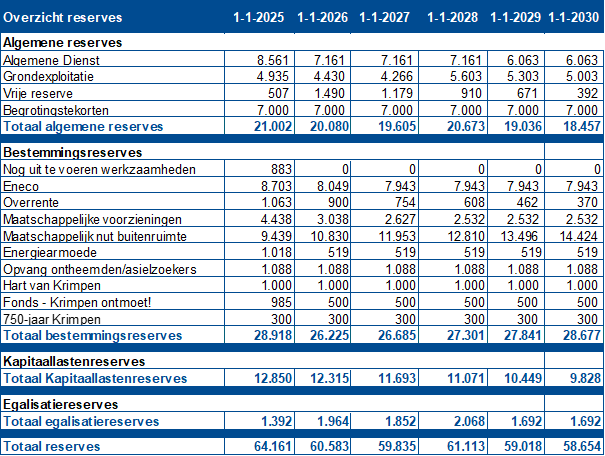 De reservepositie van Krimpen aan den IJssel is goed te noemen. Dat blijkt ook uit de solvabiliteitsratio van 45% en ook uit de ratio weerstandsvermogen van 5,24. Toch zijn er vanwege de uitdagingen en opgaven op langere termijn reserves waar wij graag extra middelen in willen storten.